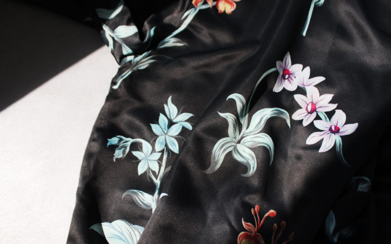野花の自然な美しさを落ち着いたクリアなカラーリングでまとめたフラワーパターン。